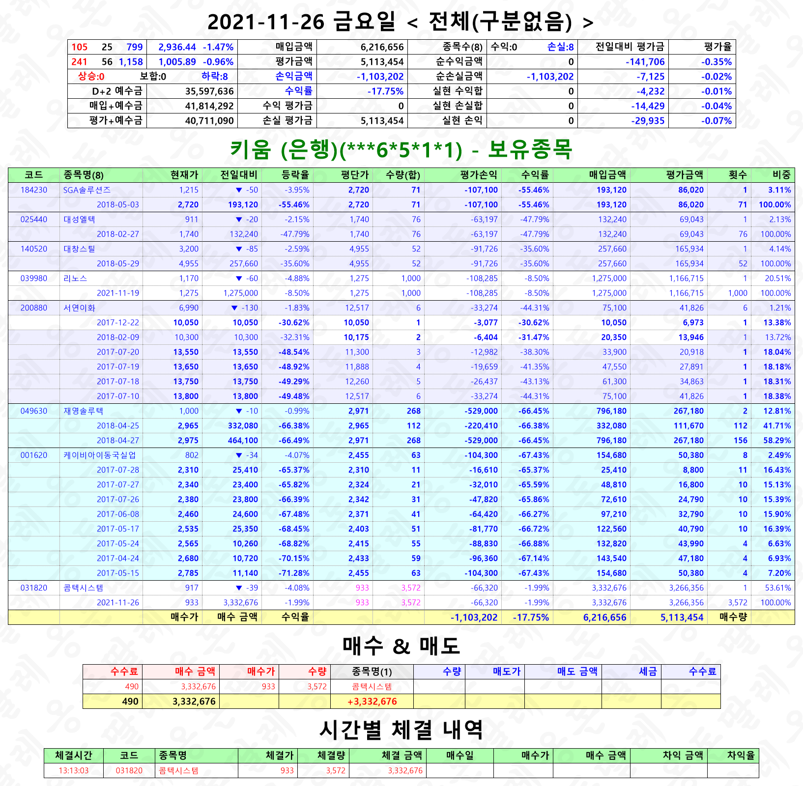 | - 1 만 4429, 연일 전일대비 손실에 인생 쫑난 느낌이다. (0) | 2021.11.23 |